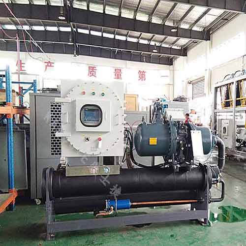 制藥業(yè)控溫用乙二醇螺桿式防爆冷水機(jī)組是以螺桿式壓縮機(jī)提供動(dòng)力的低溫控溫設(shè)備,用于易燃易爆場所。